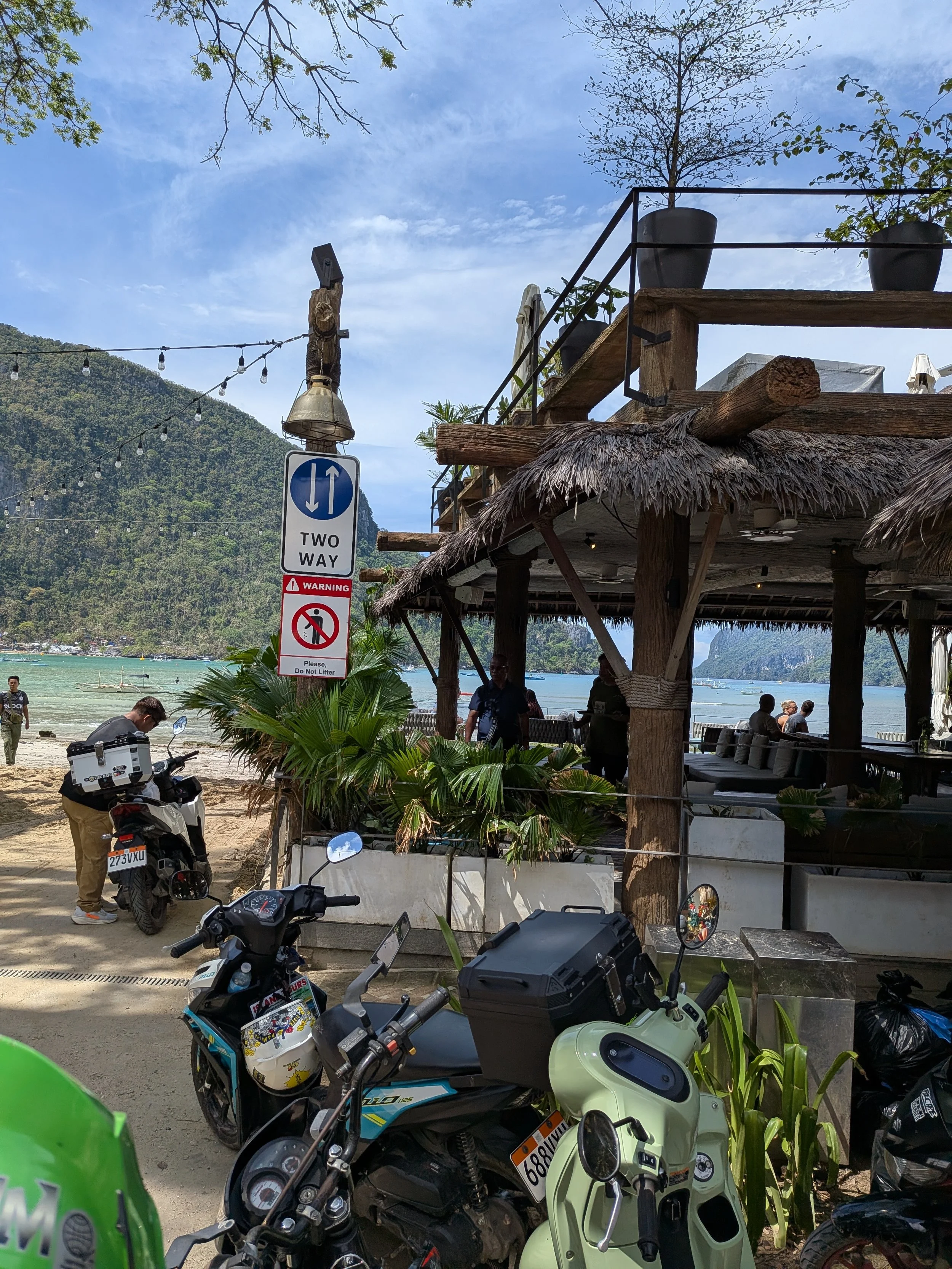 Day one in El Nido was our only free day so we rented a scooter and spent the majority of the day venturing the downtown area, savoring the sun on our shoulders, and digging our toes in the white sands. For dinner, we made sunset reservations at Henri’s, a restaurant affiliated with Lihim, and perfectly perched on top of a mountain with incredible views. It was giving major White Lotus Season 3 vibes.