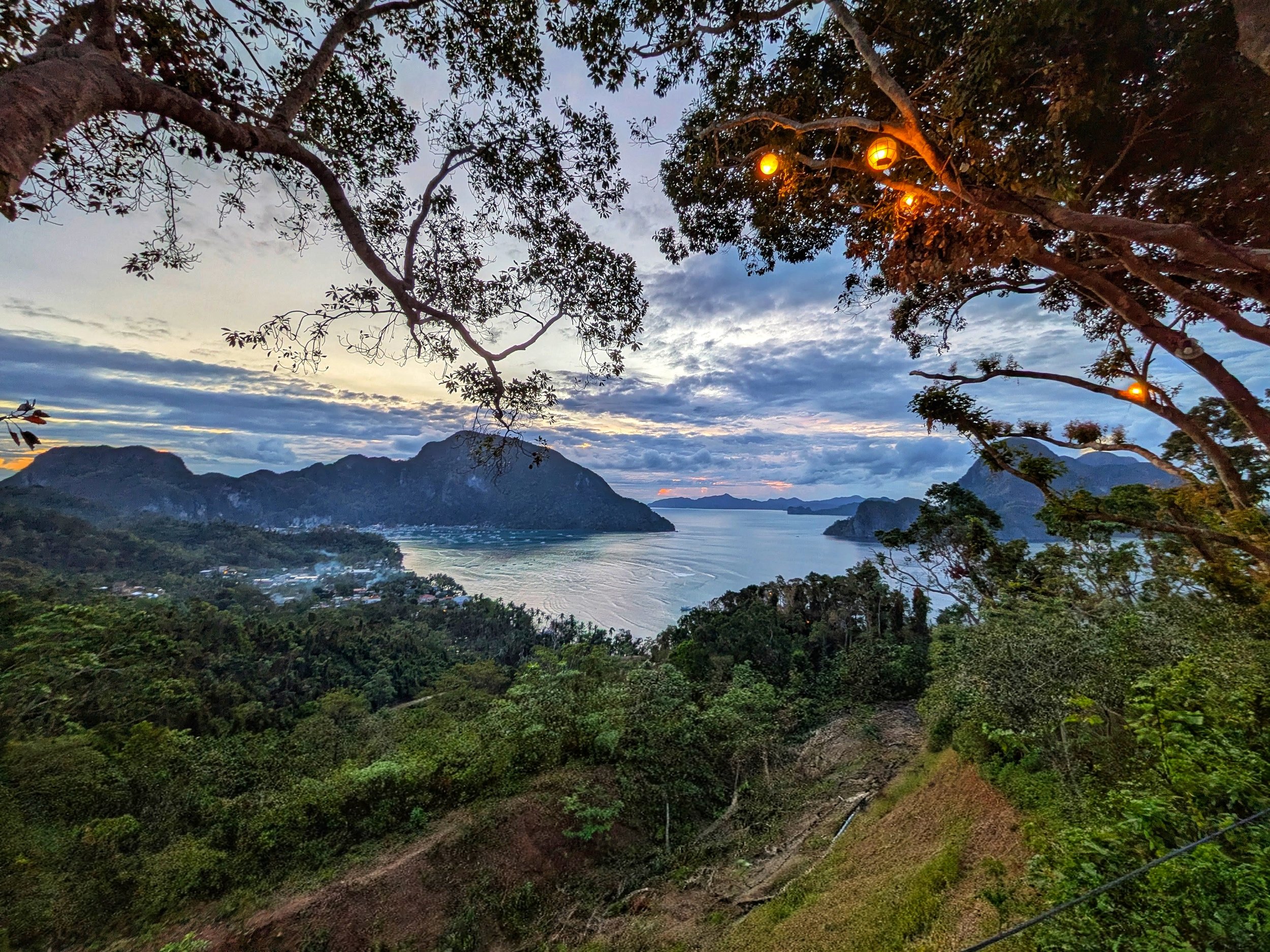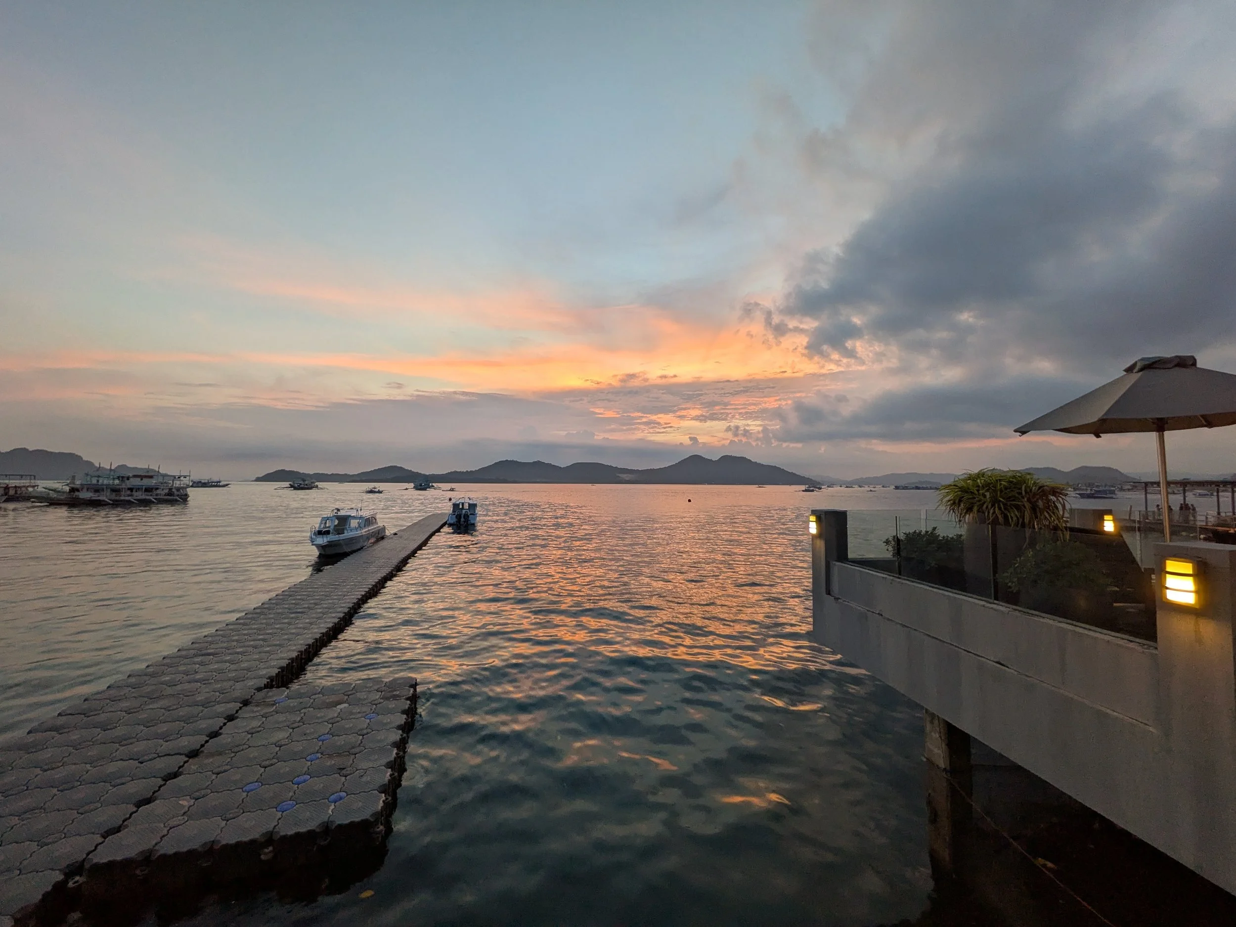 Sunset view of El Nido bay & downtown from Henri’s Restaurant in Lihim Resort